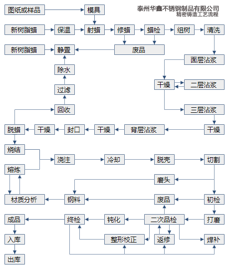 泰州華鑫不銹鋼制品有限公司自1998年從事精密鑄造以來(lái),從表面質(zhì)量、熱處理、機(jī)械性能、產(chǎn)品精度等方面克服了大量的技術(shù)難題,這使得我們的鑄件產(chǎn)品質(zhì)量一直處于領(lǐng)先水平。目前我們具有全硅溶膠不銹鋼精密鑄造加工能力500噸/年,單件產(chǎn)品重量范圍從5克至30公斤,并可提供多樣化的表面處理方案。我們生產(chǎn)的材質(zhì)一般為304不銹鋼、316不銹鋼,也可根據(jù)客戶的需求生產(chǎn)各種其他材料如碳鋼、2205雙相鋼、17-4高強(qiáng)度鋼、2520耐高溫鋼等。具體鋼種及用途請(qǐng)?jiān)L問(wèn)以下鏈接:關(guān)于鑄造材質(zhì)。